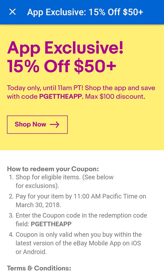 Get 15% off in the eBay app with coupon (up to $100 ... - Android Police Until 8PM tonight, you can get 15% off your purchase up to a maximum $100 discount via a coupon code. But there's one major catch: you have to make the purchase via the eBay app .